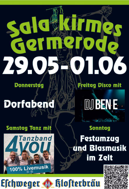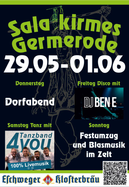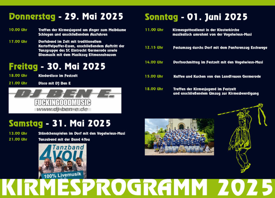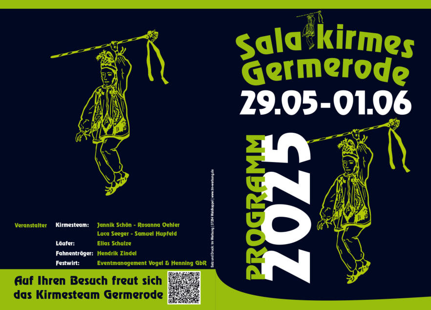 Unsere Salatkirmes in Germerode wird dieses Jahr vom 29. Mai bis 01. Juni 2025 stattfinden. Wir freuen uns sehr auf Euren Besuch!!! Das Kirmesteam 2025 mit Jannik Schön, Luca Seeger, Rosanna Oehler und Samuel Hupfeld, sowie Fahnenträger Hendrik Zindel und Kirmesläufer Elias Schulze.Hier ist unser Flyer:Und hier unser ausführlicher Programm-Flyer als PDF-Download